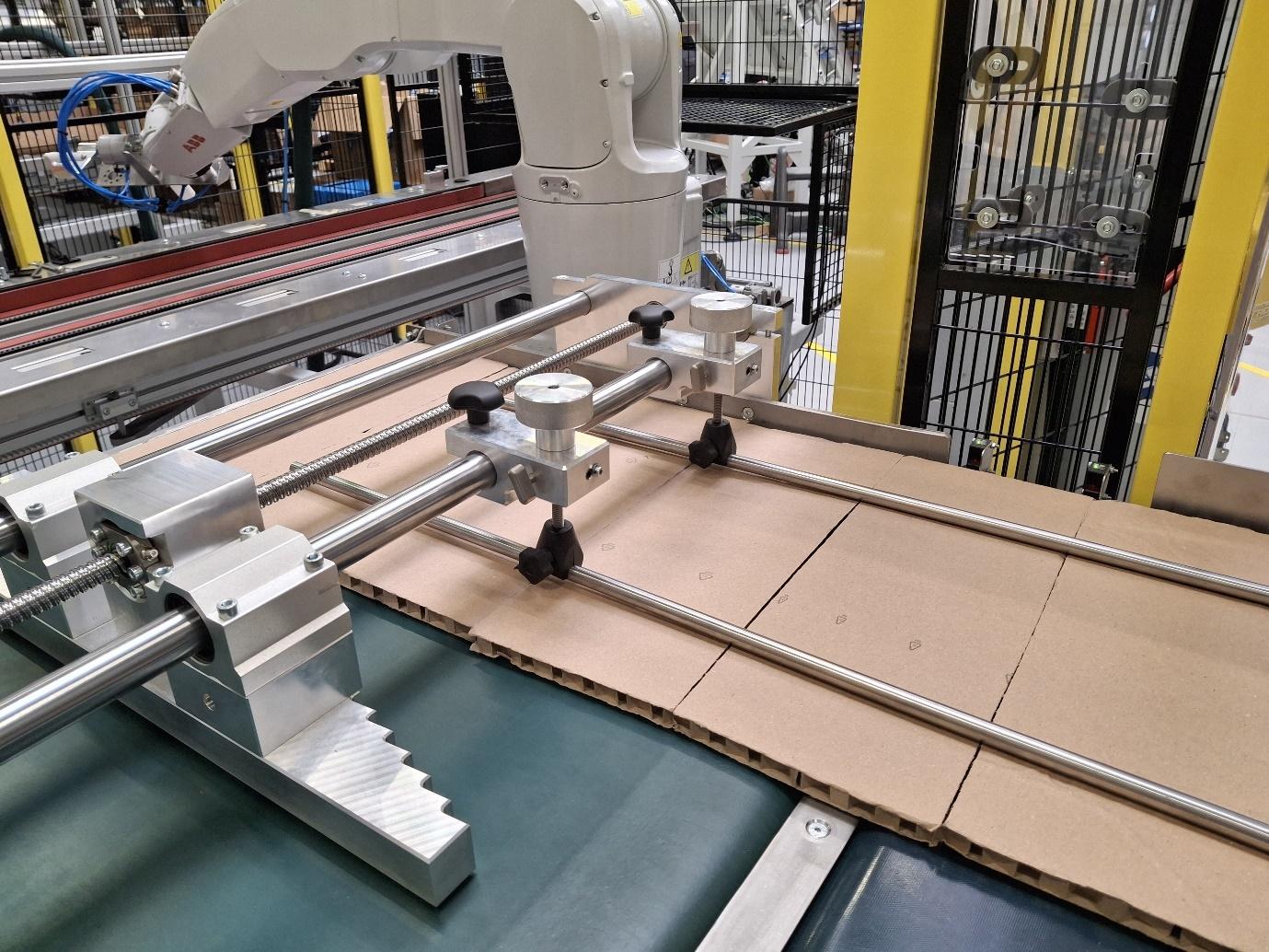 Do tej pory proces ten przeprowadzany był ręcznie. Pakiety absorberów były umieszczane w zasobniku maszyny, skąd były automatycznie transportowane warstwami do punktu pobrania, gdzie były wydawane pojedynczo. Roboty pobierały naprzemiennie absorbery i “w locie” umieszczały je w kartonie. Absorber zostawał unieruchomiony na swojej pozycji za pomocą kleju hotmelt. Kartony w maszynie poruszały się na przenośnikach pasowych z bocznym dociskiem, ich przepływ przez maszynę odbywał się z prędkością pracy całej linii pakującej. Pozostałe procesy na linii – poprzedzające i następujące – odpowiadały za pakowanie formatek mebli i pozostałych elementów ochronnych, aż do uzyskania kompletnego produktu i jego zamknięcia. Linia pakująca obsługiwała szeroki zakres rozmiarów mebli/paczek (rys. 3).