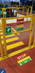 Bramki bezpieczeństwa mają bardzo szerokie zastosowanie. Mogą być wykorzystywane zarówno do regulowania ruchu klientów (np. w sklepach), jak i w celu zapewnienia bezpieczeństwa pracownikom. Jednym z potencjalnych zastosowań dla zawiasów sprężynowych mogą być samozamykające bramki bezpieczeństwa dla pracowników utrzymania ruchu w zakładach produkcyjnych. Na liniach produkcyjnych z reguły wydzielone są tory komunikacji dla wózków widłowych oraz pieszych. Samozamykające się bramki wraz z oznakowaniem i pasy wyznaczają bezpieczne miejsca przejść i zapobiegają wypadkom. Przykład takiej bramki jednego z zakładów produkcyjnych pokazano poniżej (Rys. 5).